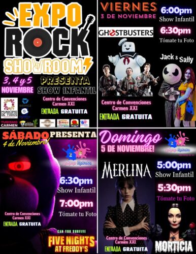 Expo Rock Showroom es la única Expo en la isla qué garantiza diversión para todas las edades y en está segunda edición también traerá diversión para los niños. El viernes 3 de Noviembre el show Infantil iniciará en punto de las 6:00pm, nos acompañarán los Cazafantasmas y estarán también Jack y Sally. El sábado 4 de Noviembre el show iniciará en punto de las 6:30pm. Presentando a Five Nights at Freddy’s El domingo 5 de Noviembre el show infantil dará inicio a las 5:00pm y por temporada tendremos con nosotros a Merlina y Morticia El Show Hakuna Matata serán los que van garantizar la diversión en grande para todos nuestros niños en Expo Rock. TODOS los eventos son completamente GRATUITOS AL PÚBLICO EN GENERAL. La cita es en el Centro de Convenciones Carmen XXI. Leer Mas »