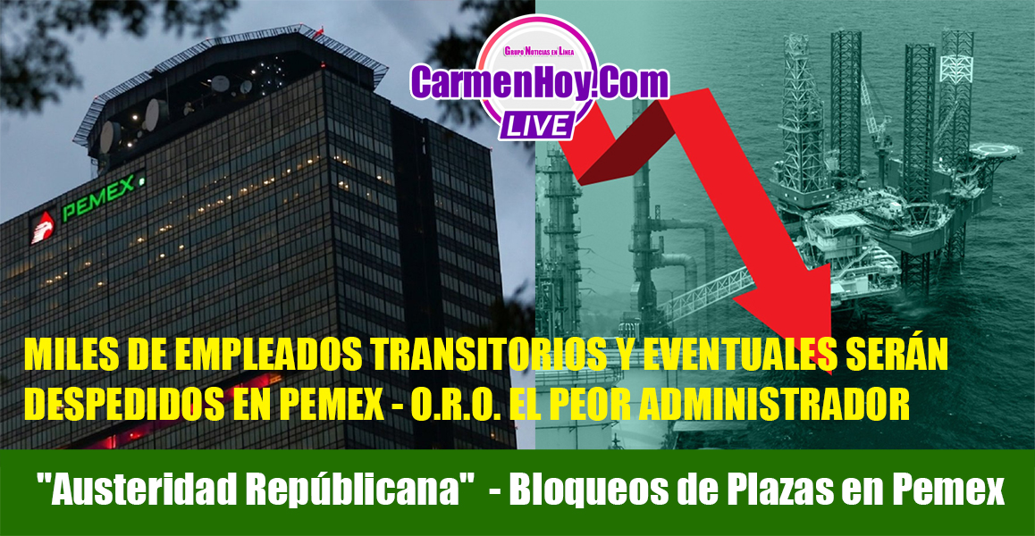 La estrategia “Plan de Austeridad Republicana” para la Petrolera Petróleos Mexicanos pone en jaque a más de 10 mil trabajadores transitorios y eventuales próximos a ser despedidos por la Paraestatal, y en estos momentos ya afecta en directo a la “Guardia Cero” continuando con las demás secciones del país y de esta manera terminaría por hundir a Ciudad del Carmen, Campeche convirtiéndolo ahora si en un pueblo fantasma.