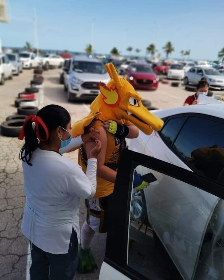 Con disfraz de pokemón un joven campechano asistió a vacunarse al foro Ah Kim Pech, pues un usuario compartió el momento de la inmunización de esta persona.