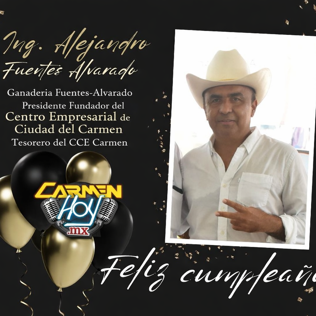 El Ing. Jorge Alberto Cruz Mendoza y todo el equipo que conforma el Grupo Noticias en Línea CarmeHoy.Mx le mandan sus más sinceras felicitaciones al Ing. Alejandro Fuentes Alvarado de Ganadería Fuentes-Alvarado y Presidente Funfador del Centro Empresarial de Ciudad del Carmen y Tesorero del CCE Carmen por motivo de su cumpleaños, deséandole el mejor de los éxitos y excelente cumpleaños.