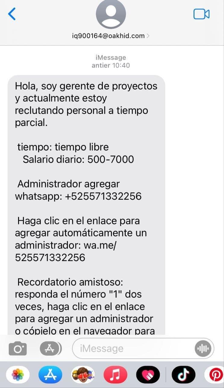 En otros mensajes informan que son gerentes de proyectos y reclutan personal a tiempo parcial con sueldos que van desde los 500 hasta los siete mil pesos.