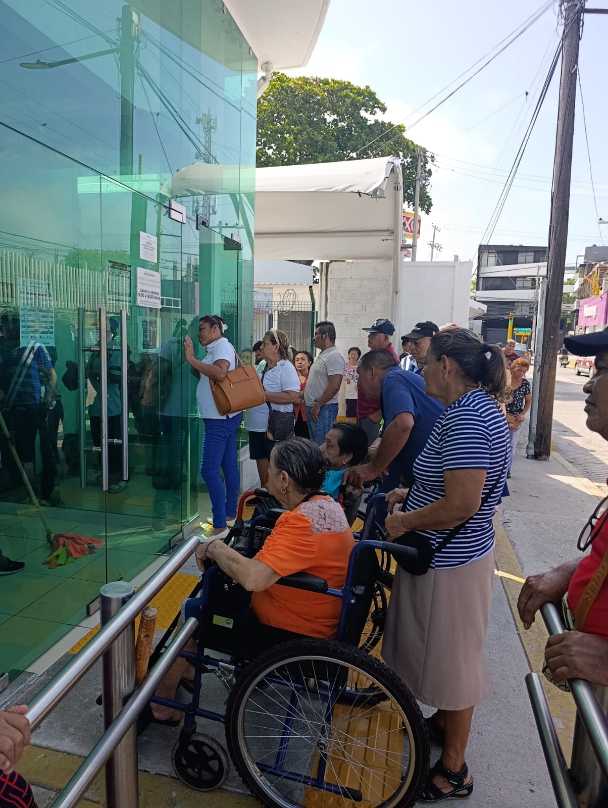 Al llegar, nos topamos con una larga fila de personas mayores, algunas en sillas de ruedas, otras con bastones o andaderas, soportando el sol inclemente sin sillas, sombra ni asistencia. Muchos estaban solos. ☀️