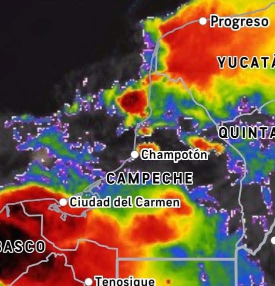 Imágenes de satélite muestran núcleos de tormenta sobre el litoral del Estado de #Campeche, así como en las regiones #Sur y #Oriente, con desplazamiento hacia la zona costera.