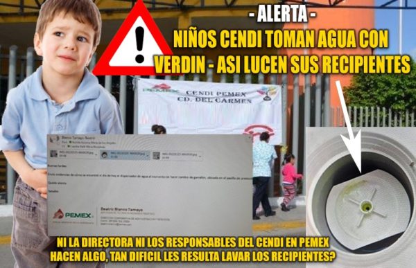 Detectan agua “potable” con verdín en garrafones y en recipientes del Cendi de Pemex en Cd del Carmen – AGUA que todo los dias consumen los niños y las propias maestras de dicho CENDI.