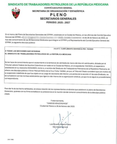 “Se ofrece una disculpa pública a Víctor Manuel Kidnie de la Cruz (F-154364)!!!, ya que, el tribunal citado consideró que con motivo de la suspensión indefinida de que fue objeto en su cargo de secretario del Interior y Acuerdos de la Sección 47 STPRM, no se cumplieron con las normas estatutarias que rigen la vida interna de la organización sindical, ya que no se siguió el procedimiento correspondiente”.