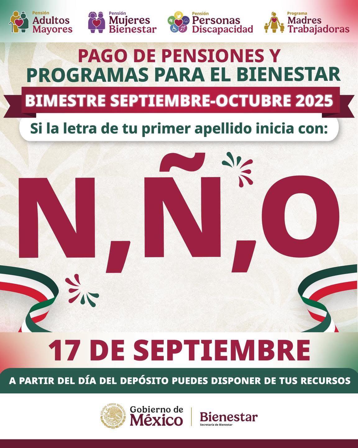 Si tu apellido comienza con las letras N, Ñ, O; a partir del 17 de septiembre, podrás disponer de tu recurso correspondiente al bimestre septiembre-octubre de las #PensionesBienestar y del programa #MadresTrabajadoras.