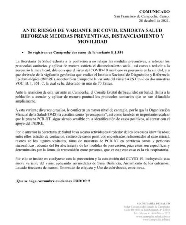 La Secretaría de Salud exhorta a la población a no relajar las medidas preventivas, a reforzar los protocolos sanitarios y aplicar de manera estricta el distanciamiento social, así como a reducir a lo necesario la movilidad, debido a que el virus del COVID-19 mantiene su presencia en la entidad, y a que -derivado de la vigilancia genómica que realiza el Instituto Nacional de Diagnóstico y Referencia Epidemiológica (INDRE)- se detectó en Campeche la variante del virus SARS Cov-2 en dos muestras VOC. B. 1. 351. C, la cual se ha detectado en más de 70 países.