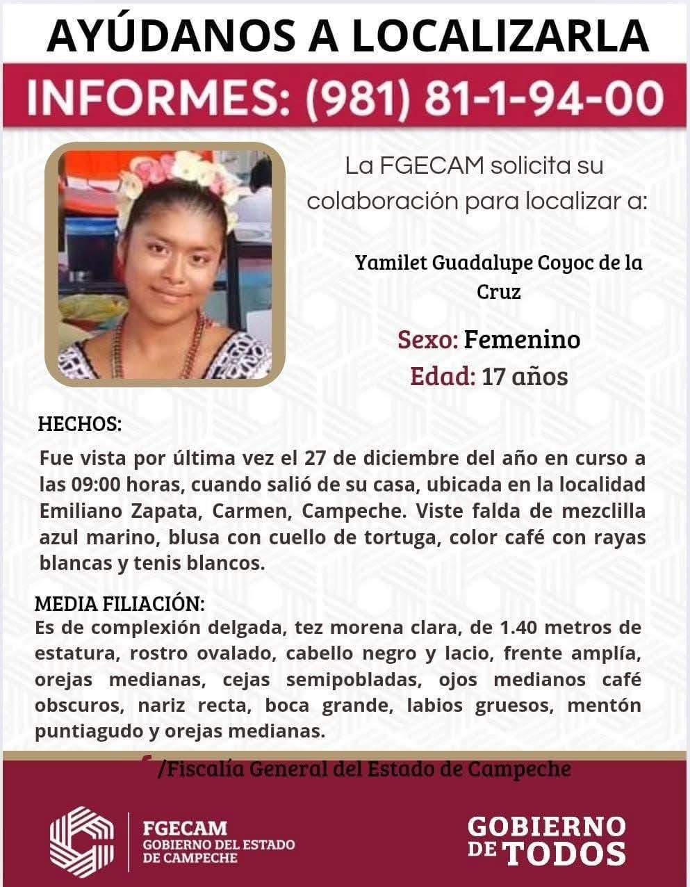 7. Yamilet Guadalupe de 17 años de edad, vista por última vez el 27 de diciembre