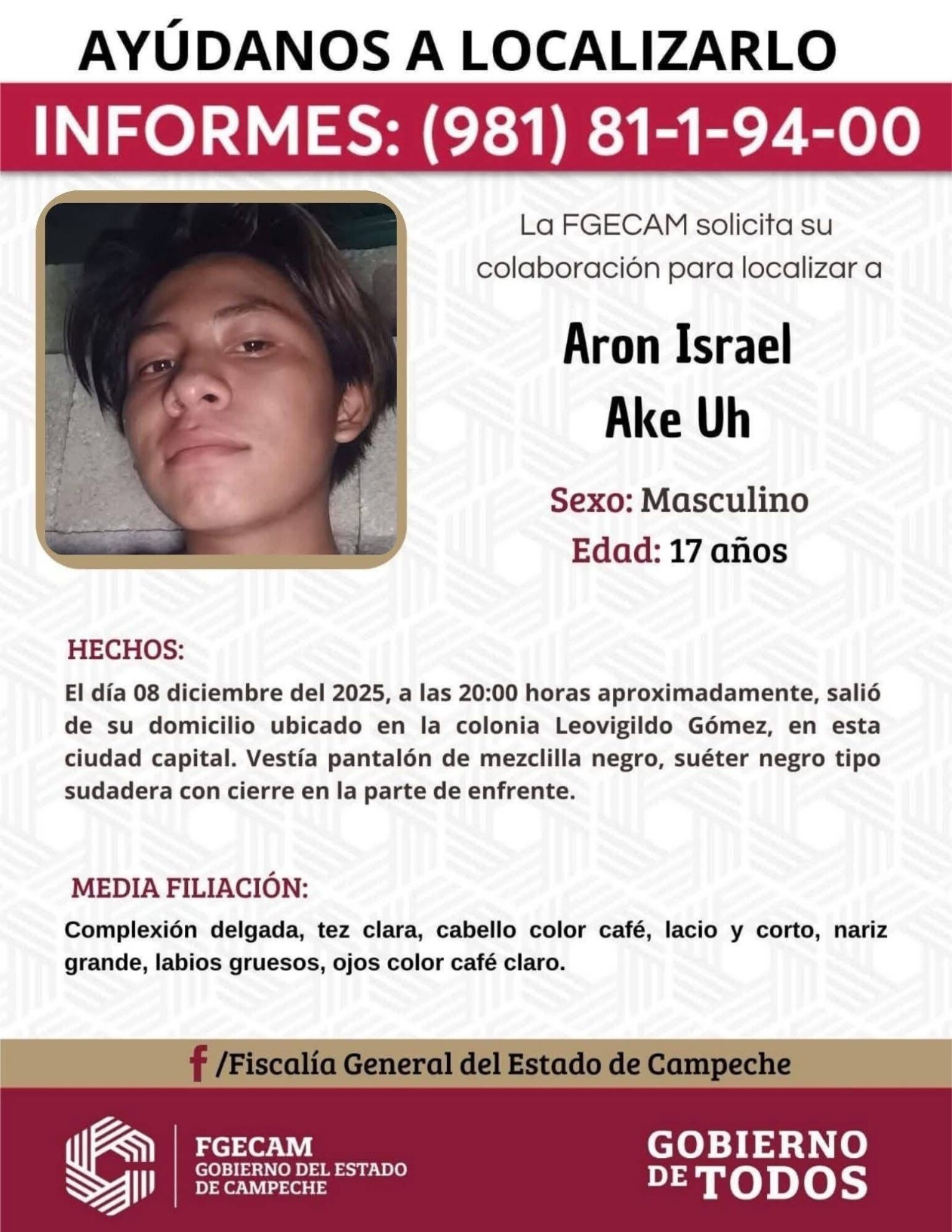 1. Aaron Israel de 17 años de edad, desaparecido desde el 8 de diciembre