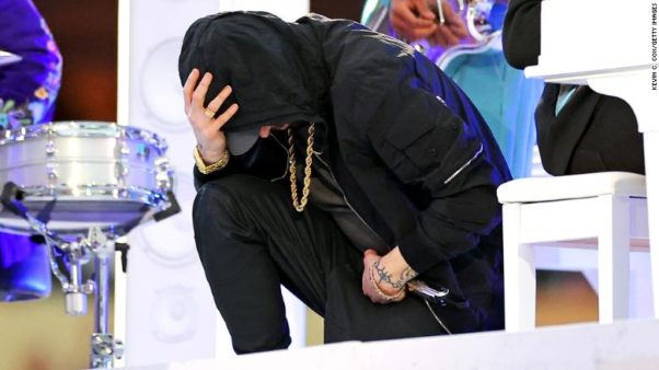 El hecho tuvo lugar después de que el rapero interpretara su éxito de 2002 “Lose Yourself”. El gesto de arrodillarse se convirtió en tema de controversia cuando el ex mariscal de campo de la NFL, Colin Kaepernick, lo usó como un acto de protesta contra la brutalidad policial y la discriminación racial.