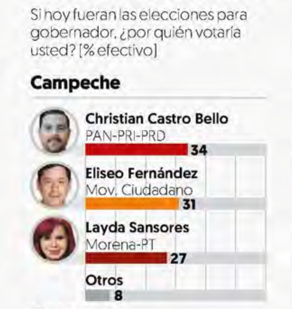 Aventaja la coalición PRI-PAN-PRD en Campeche esto lo dio a conocer la encuesta del Financiero, hace apenas unas semanas se marcaba una elección cerrada, hoy el candidato Christian Castro Bello se pone a la cabeza con un 34% de intención del voto.