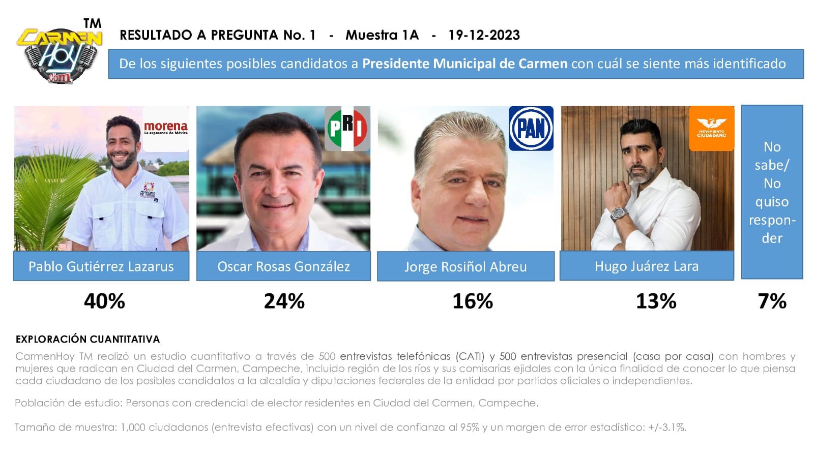 Les presentamos el resultado de la encuesta realizada por CarmenHoy TM en la cuál se entrevistó de manera telefónica a 500 personas y 500 personas entrevistadas casa por casa, con la pregunta ” De los Siguientes posibles candidatos a Presidente Municipal de Carmen, con cuál se siente más identificado”.