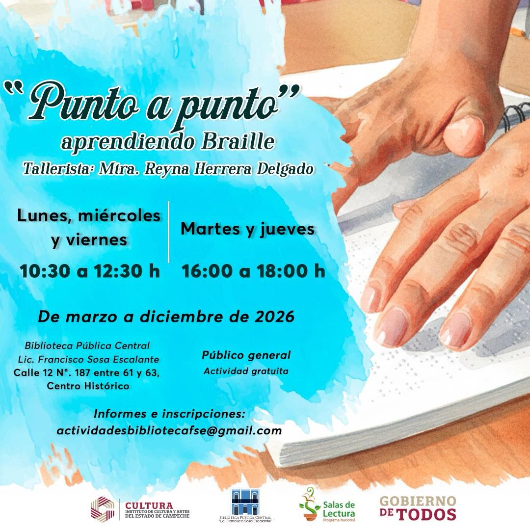 En la Biblioteca Pública Central Lic. Francisco Sosa Escalante se impartirá el taller gratuito “Punto a Punto, Aprendiendo Braille”, a cargo de la Mtra. Reyna Herrera Delgado, de marzo a diciembre de 2026.