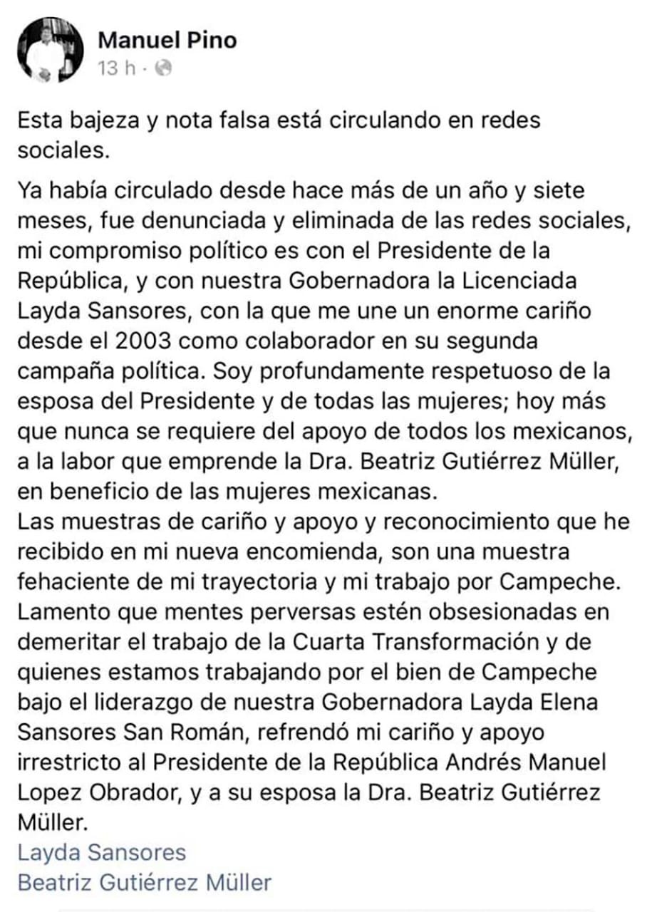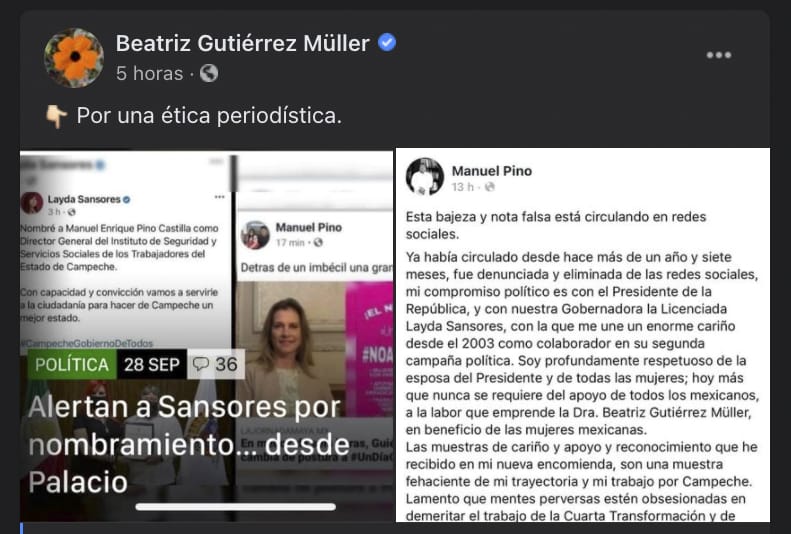 Horas más tarde, Gutiérrez Müller respondió en su cuenta de Facebook “Por una ética periodística”, y señala las publicaciones falsas y la aclaración tanto de la gobernadora Sansores San Román como de Pino Castilla.