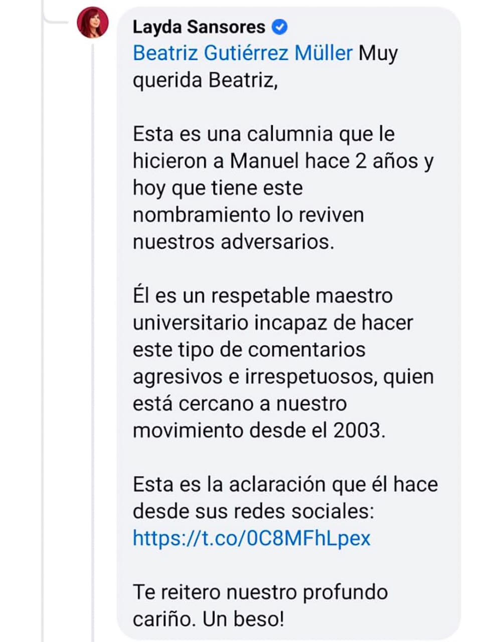 Escribió: “Mi compromiso político es con el Presidente de la República, y con nuestra gobernadora la Licenciada Layda Sansores, con la que me une un enorme cariño desde el 2003 como colaborador en su segunda campaña política. Soy profundamente respetuoso de la esposa del Presidente y de todas las mujeres; hoy más que nunca se requiere del apoyo de todos los mexicanos, a la labor que emprende la Dra. Beatriz Gutiérrez Müller, en beneficio de las mujeres mexicanas”.