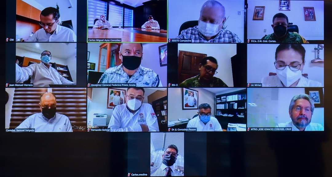 Para dar continuidad a los trabajos de la Mesa Estatal para la Construcción de la Paz, el gobernador Carlos Miguel Aysa González, junto con funcionarios de los tres órdenes de gobierno y representantes de las Fuerzas Armadas y de la Guardia Nacional, sostuvo una reunión virtual donde analizaron la situación epidemiológica del COVID-19 y los reportes relacionados con la seguridad pública y protección civil, a fin de reforzar estrategias o establecer nuevas medidas que garanticen el bienestar de todos los campechanos.