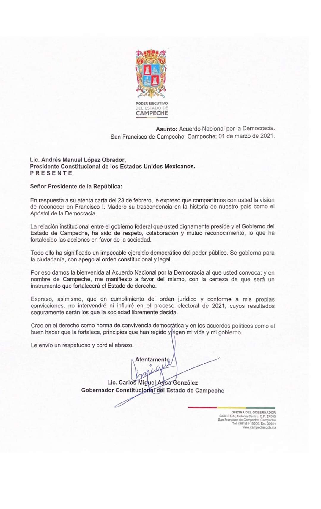 Hace unos momentos, en respuesta a la convocatoria del presidente Andrés Manuel López Obrador, el gobernador Carlos Miguel Aysa González y se ha sumado al Acuerdo Nacional por la Democracia. Campeche y México saldrán fortalecidos de estas elecciones.