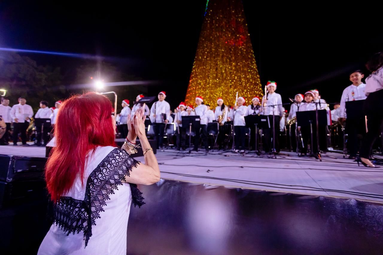 Al pie del gigantesco árbol, integrantes de las bandas infantiles y juveniles comunitarias de Hopelchén, Seybaplaya, Escárcega y Tenabo que, antes, al mediodía, recibieron sus nuevos instrumentos, interpretaron magistralmente diversos villancicos y piezas musicales de la entidad, como Las Torres de Catedral.