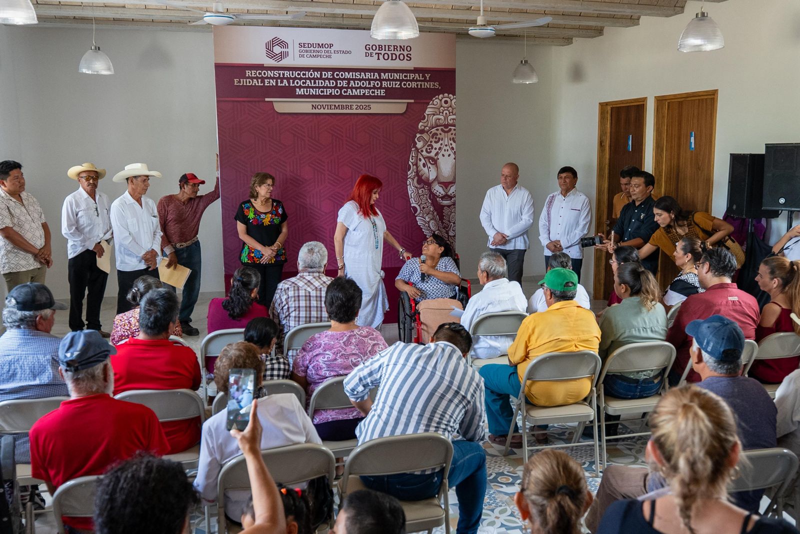 La Gobernadora Sansores San Román estuvo acompañada de Liz Hernández Romero, secretaria de Gobierno; Bernhard Rehn, encargado del Despacho de la Secretaría de Desarrollo Urbano, Movilidad y Obras Públicas; Esteban Hinojosa Rebolledo, titular de la Secretaría Estatal de Bienestar, pero sobre todo de los habitantes de la comunidad Ruiz Cortines.