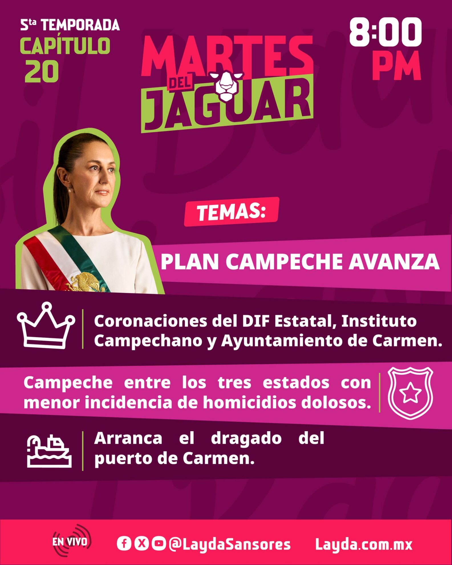 Hoy en el #MartesDelJaguar hablaremos sobre el avance del Plan Campeche; de las coronaciones del DIF Estatal Campeche, el Instituto Campechano y el Ayuntamiento de Carmen.