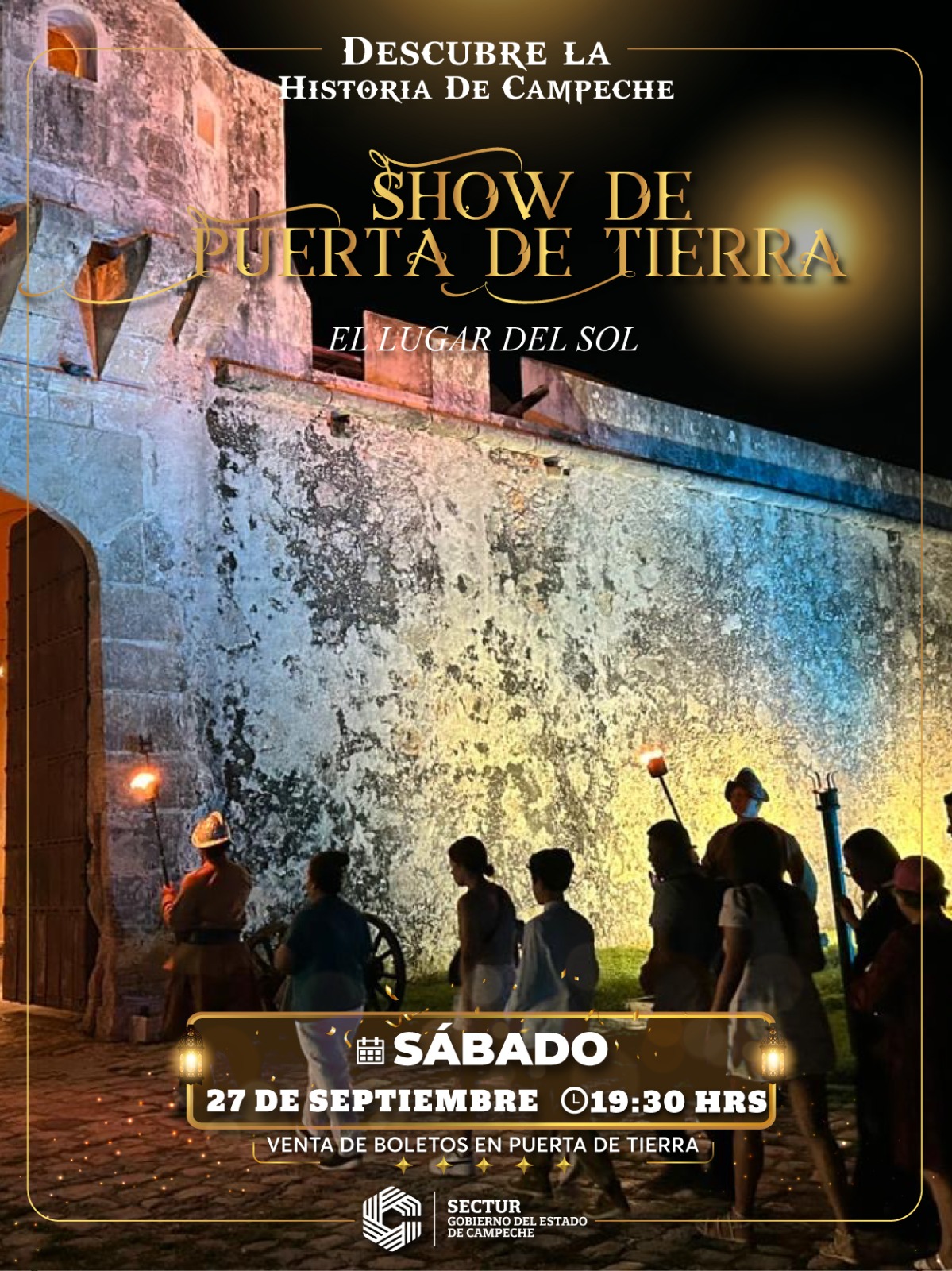 Descubre la historia de Campeche. Vive un espectáculo nocturno interactivo de música y luces en la Puerta de Tierra.