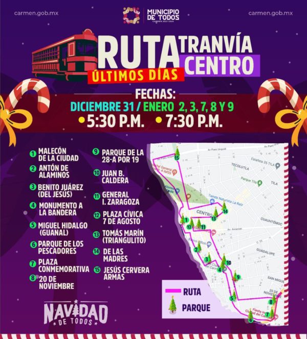 Para que las familias carmelitas disfruten visitando los parques decorados durante esta temporada de fin de año, el Gobierno Municipal de Carmen, a través de la Coordinación de Turismo, amplía dos semanas más el servicio de los recorridos gratuitos en tranvía.