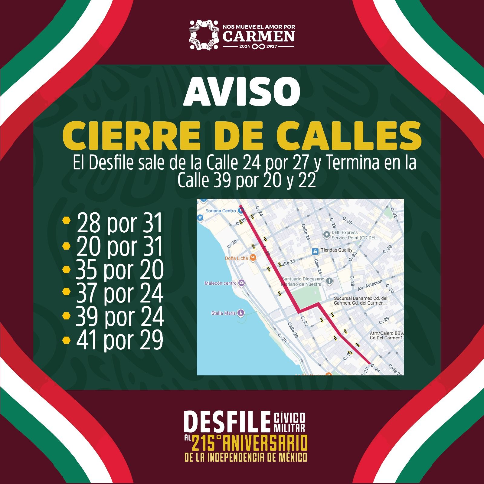 AVISO de cierre de vialidades por la realización del Desfile Cívico-Militar del 215° Aniversario de nuestra Independencia.