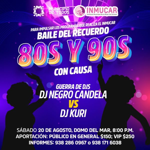 El Baile del Recuerdo “80s y 90s con Causa” contará con la guerra de DJs, con la amenización de DJ Negro Candela y DJ Kuri, que se realizará el sábado 20 en el Domo del Mar en punto de las 8:00 P.M., se contará con la venta de boletos, a 150 pesos el pase general y en 250 el pase VIP.