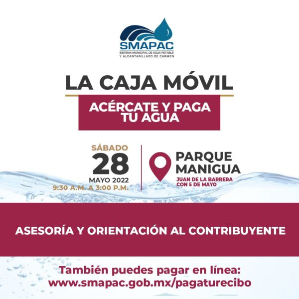 Para que ahorres tiempo y que los trámites sean más accesibles, este sábado 28 de mayo la CAJA MÓVIL del SMAPAC estará en el Parque de la colonia Manigua de 9:30 A.M. a 3:00 P.M., donde podrás realizar tu pago de agua potable.