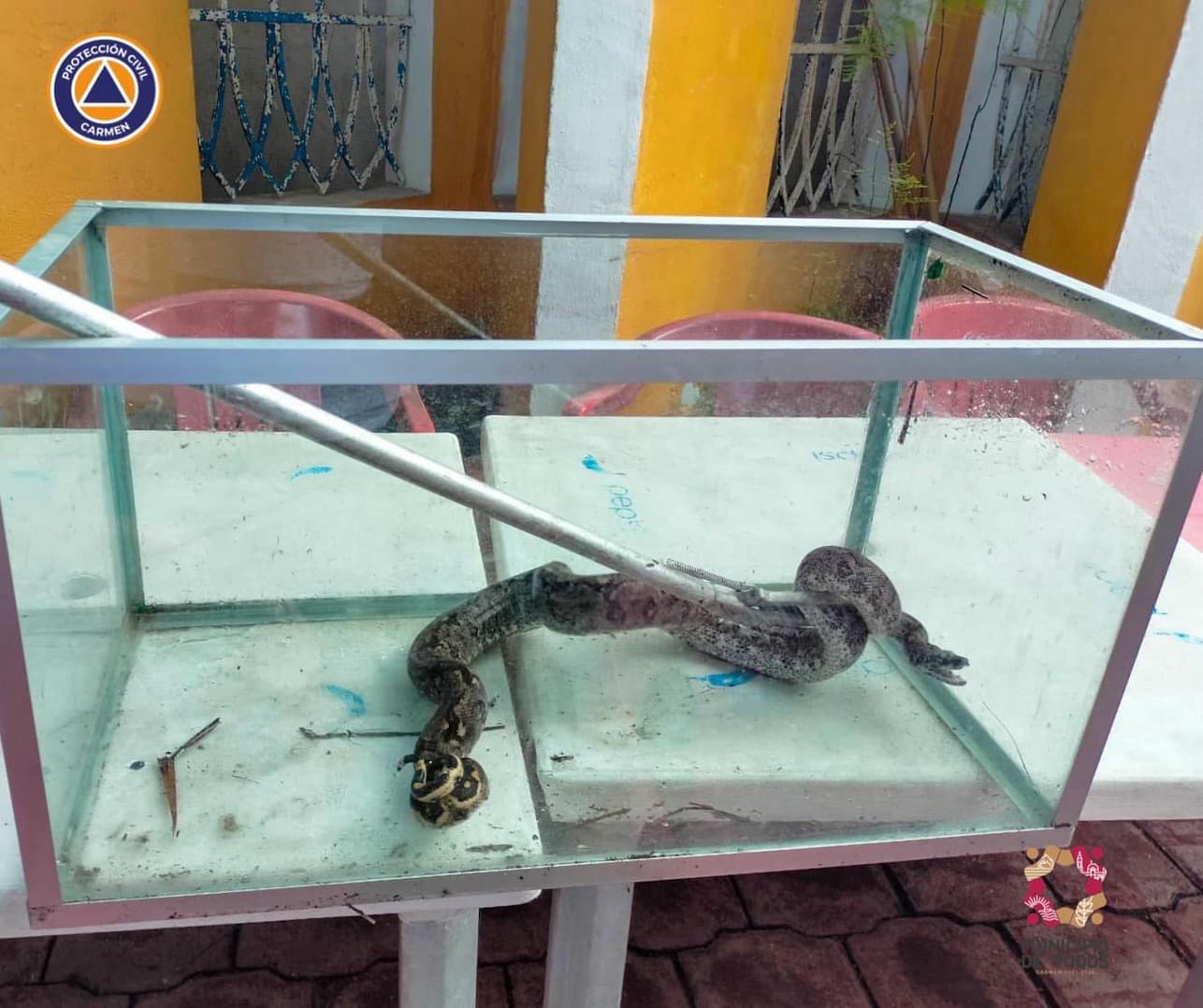 Protección Civil Carmen atendió reporte de un reptil en el Colegio Iberoamericano, el ejemplar fue capturado y liberado en un espacio adecuado para integrarse en su hábitat.
