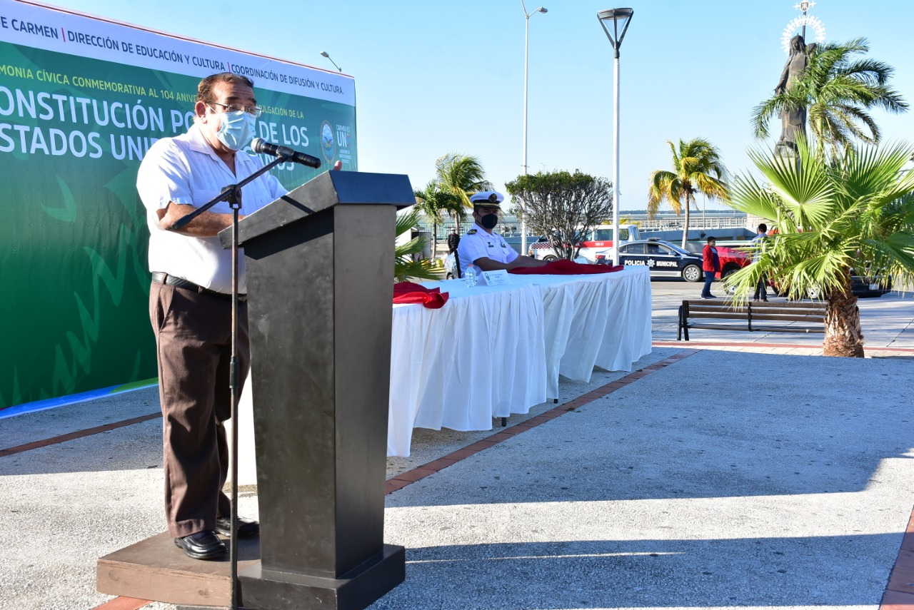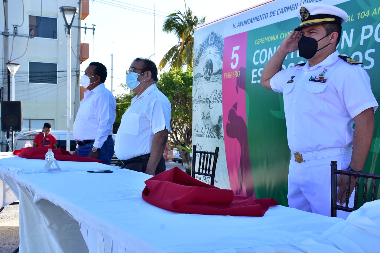 El Gobierno Municipal de Carmen a través de la Dirección de Educación y Cultura realizó la ceremonia cívica conmemorativa al 104 Aniversario de la Promulgación de la Constitución Política de los Estados Unidos Mexicanos en la explanada del asta bandera del malecón de la zona centro de la ciudad.
