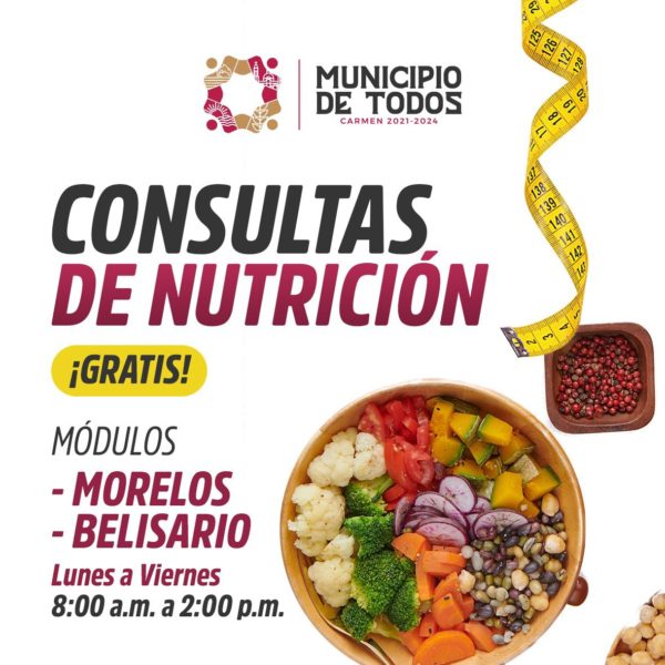Para brindar un cuidado integral de la salud, el Gobierno de Carmen, como Municipio Ejemplo, tiene para ti CONSULTAS DE NUTRICIÓN GRATIS en los Módulos de Bienestar de Morelos y Belisario, en horario de lunes a viernes de 8:00 A.M. a 2:00 P.M.