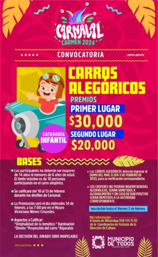 Impulsando las más grandes tradiciones en el #MunicipioDeTodos, el Gobierno Municipal de Carmen que encabeza el Alcalde Pablo Gutiérrez Lazarus, te invita a participar en los diversos concursos que se realizarán en el marco de las fiestas carnestolendas, en su edición 2024.
