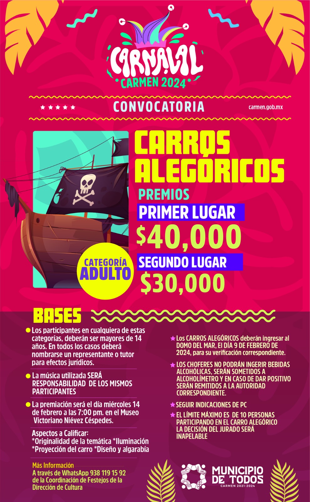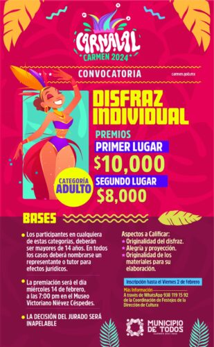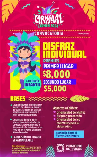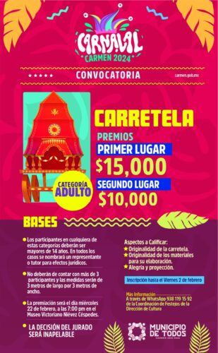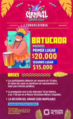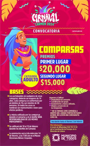 ¡Sé parte de Carnaval Carmen 2024! Para mayor información comunícate a la Coordinación de Festejos de la Dirección de Cultura a través del WhatsApp: 938 119 1592.