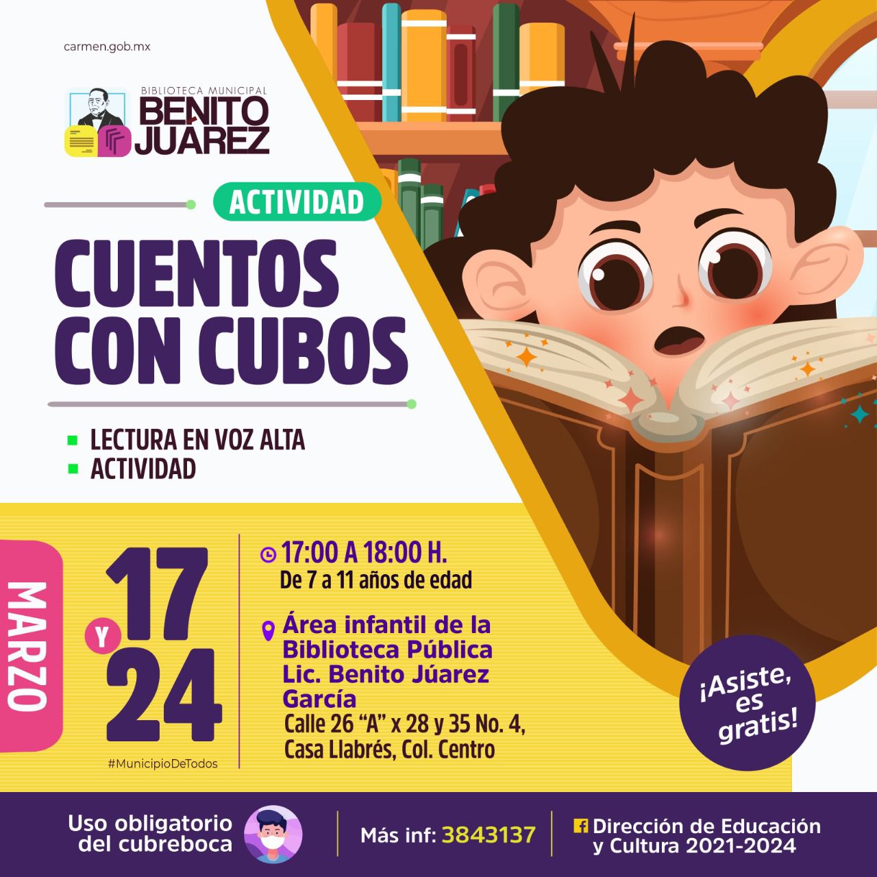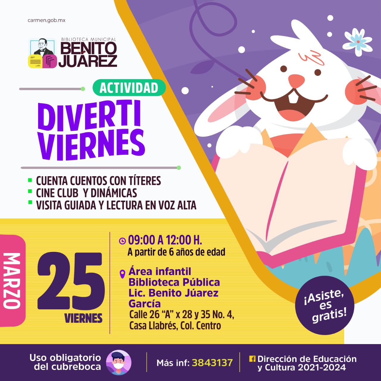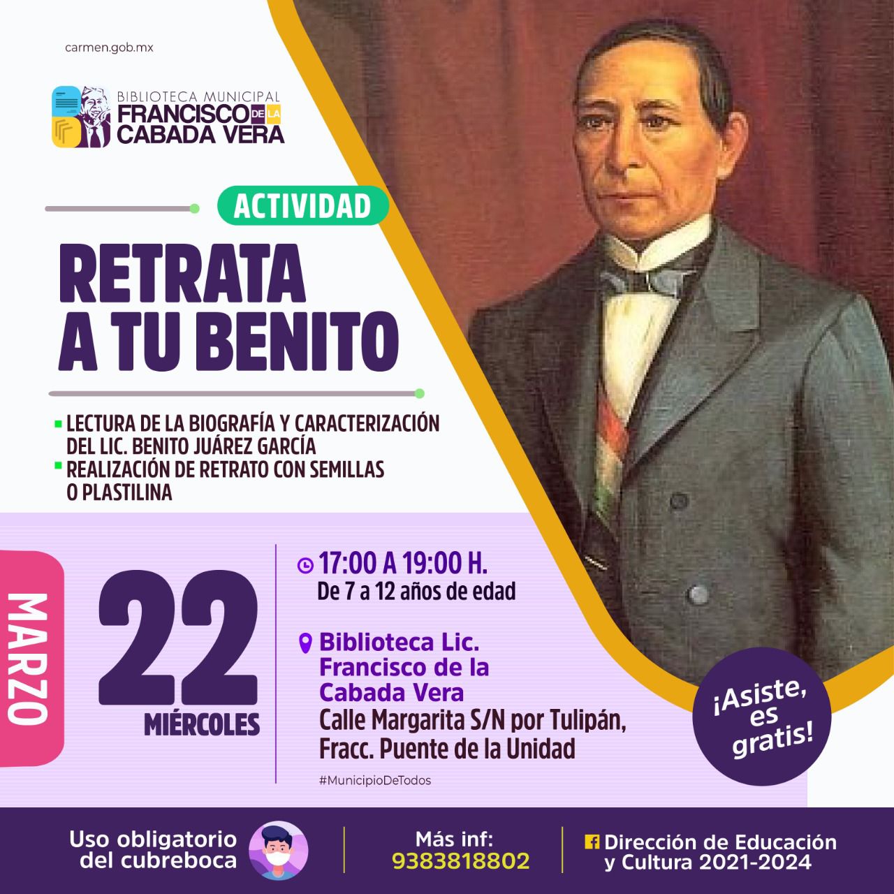 En la Biblioteca Municipal Francisco de la Cabada Vera se hará la actividad “Retrata a tu Benito”, el miércoles 22 de marzo, de 5:00 a 7:00 P.M. para los niños de 7 a 12 años de edad. “Los viernes te cuento” el 25 de este mes de 10:00 A.M. a 12:00 P.M. para pequeños de 6 a 12 años.