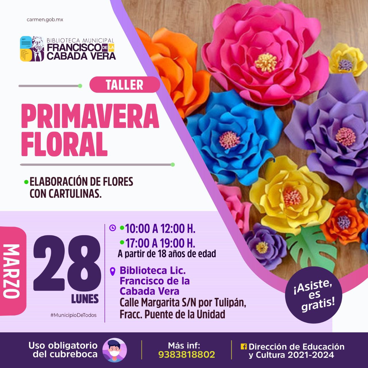 Finalmente, el taller “Primavera floral”, donde aprenderás la elaboración de flores con papel cartulina, el lunes 28 en dos horarios, de 10:00 A.M. a 12:00 P.M. y de 5:00 P.M. a 7:00 P.M. para adultos de 18 años en adelante.