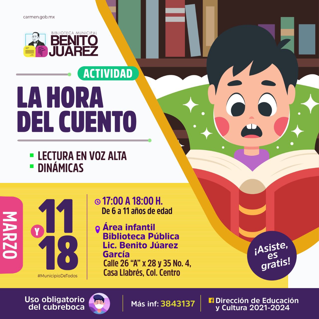 En la Biblioteca Municipal Benito Juárez García se realizará el “si no te mueves, te entumes”, que será los días 10 y 11 de este mes de 9:00 a 10:00 A.M. para niños y jóvenes de 8 a 15 años. “La hora del cuento” se efectuará los días 11 y 18 de 5:00 a 6:00 P.M., para público infantil de 6 a 11 años.