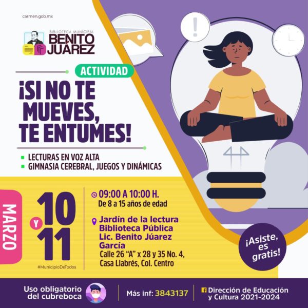 En la Biblioteca Municipal Benito Juárez García se realizará el “si no te mueves, te entumes”, que será los días 10 y 11 de este mes de 9:00 a 10:00 A.M. para niños y jóvenes de 8 a 15 años. “La hora del cuento” se efectuará los días 11 y 18 de 5:00 a 6:00 P.M., para público infantil de 6 a 11 años.