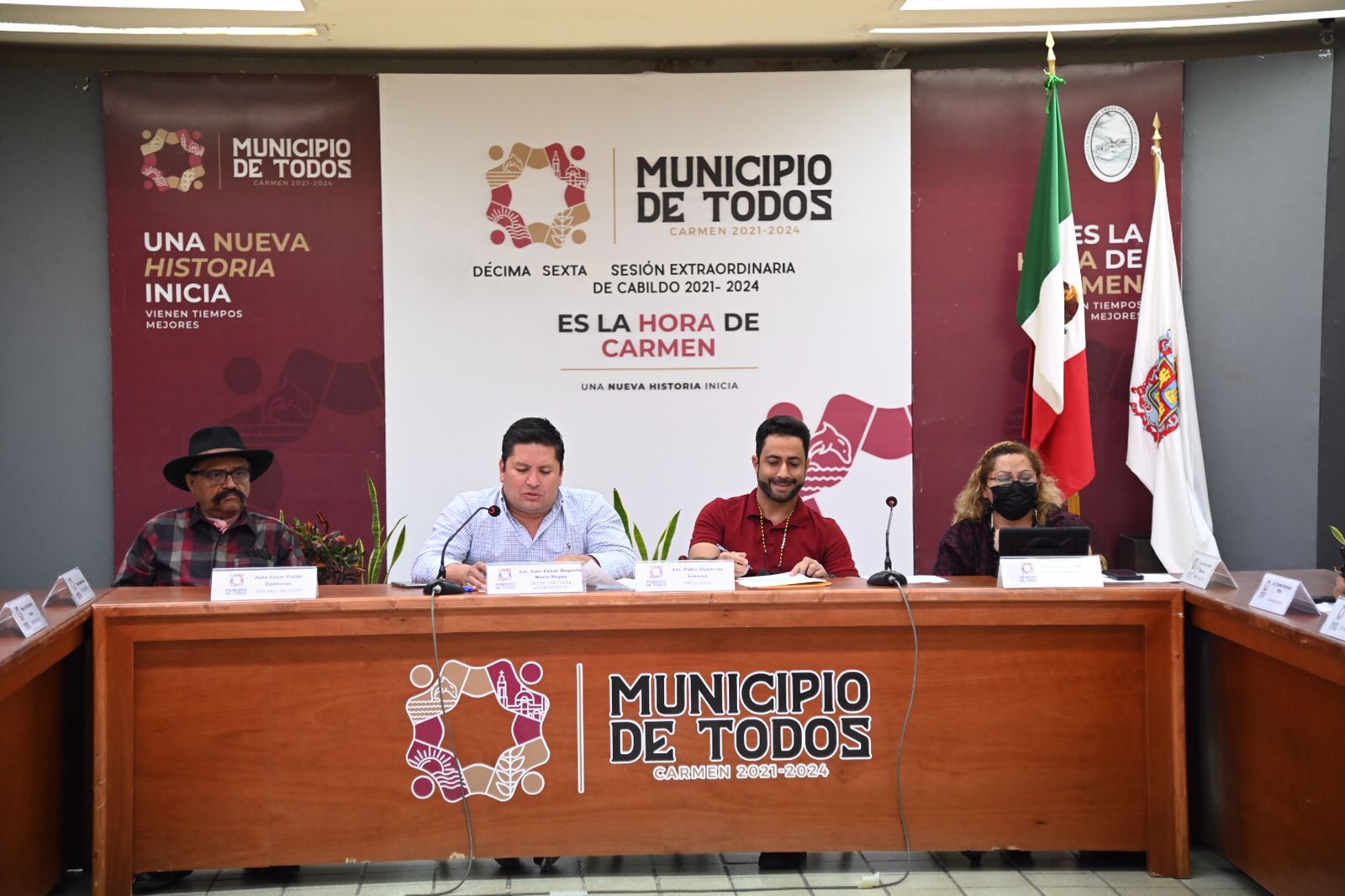 Estuvieron presentes: el Presidente Municipal, Pablo Gutiérrez Lazarus; el Secretario del Ayuntamiento, Luis César Augusto Marín Reyes; la Primera Regidora, Candelaria Isabel Tenreyro Contreras; el Segundo Regidor, Julio César Pulido Contreras; la Tercera Regidora, María Zaira Sánchez Huerta; la Quinta Regidora, Priscilla Isabel Heredia Novelo; Sexto Regidor, José Daniel Hernández Sosa; la Séptima Regidora, Francisca Zárate López; la Octava Regidora, Silvia Cámara León.