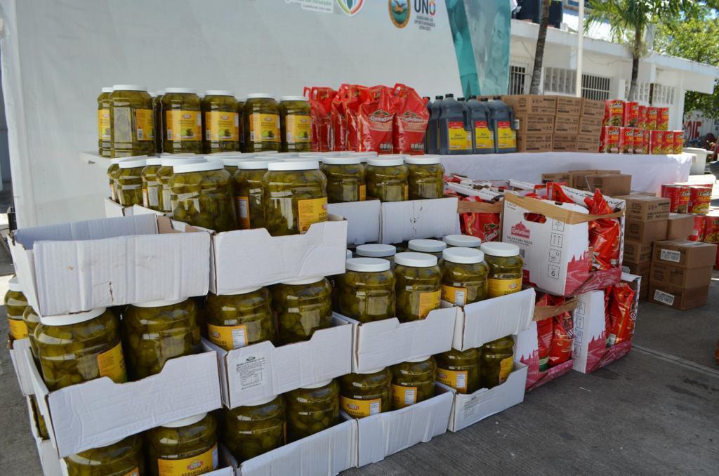 Lo entregado consistió en 52 botes de pepinillos, 14 mil 800 sobres de cátsup contenidas en 74 cajas, 66 botes de jugo sazonador, 120 latas de chiles jalapeños, así como 76 bolsas de salsa para pizza, 2 frascos de verduras, 20 botes de polvo sazonador Knor, 4 botes de aderezo y dos cubetas de mayonesa.