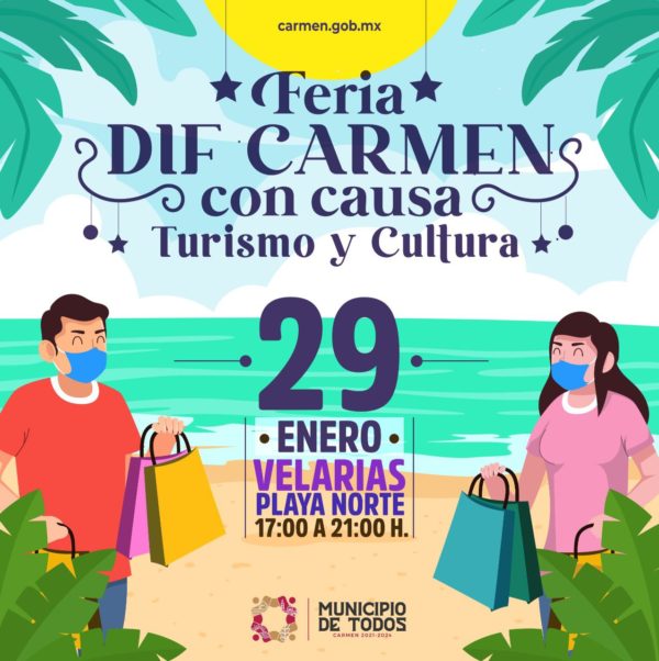 Contando con la participación de emprendedores y comerciantes locales, DIF Carmen 2021 – 2024, la Dirección de Educación y Cultura 2021-2024 y la Coordinación de Turismo Carmen 2021-2024, te invitan a asistir a la “Feria DIF Carmen con Causa”, la cual se realizará este sábado 29 de enero de 5:00 P.M. a 9:00 P.M. en las Velarias ubicadas en Playa Norte.