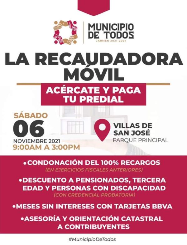 Cabe señalar que la Recaudadora Móvil estará cada sábado en diferentes colonias y fraccionamientos, acercando este servicio a todos. ¡El Municipio de Todos te necesita! Así que acude y ponte al día con tus contribuciones.
