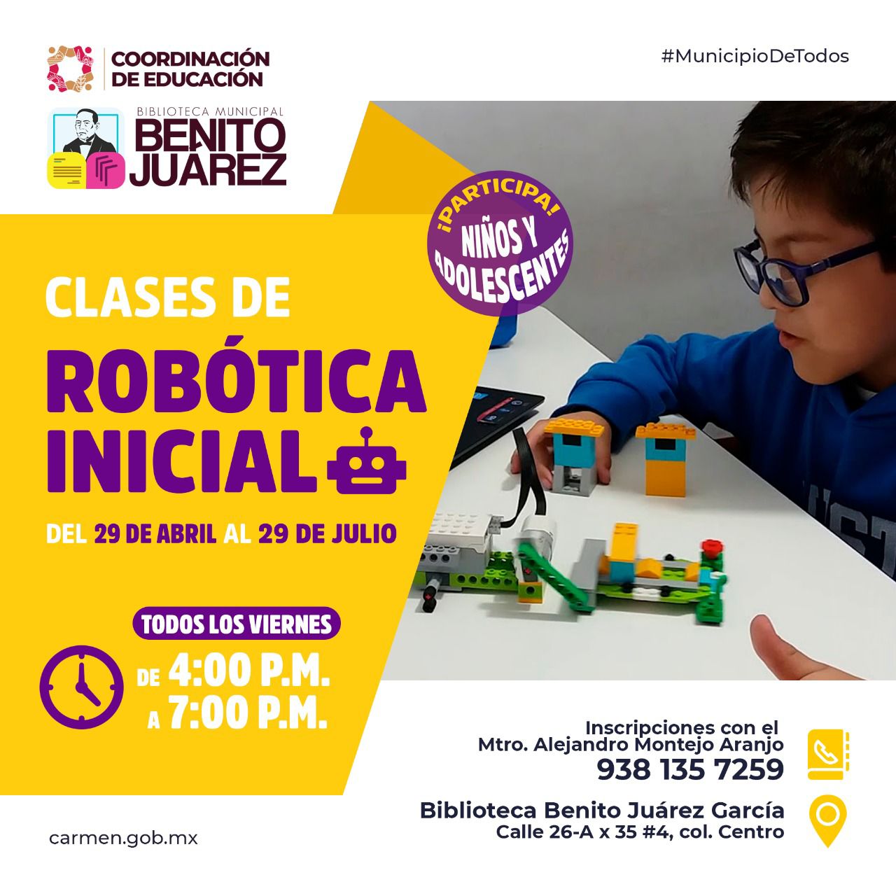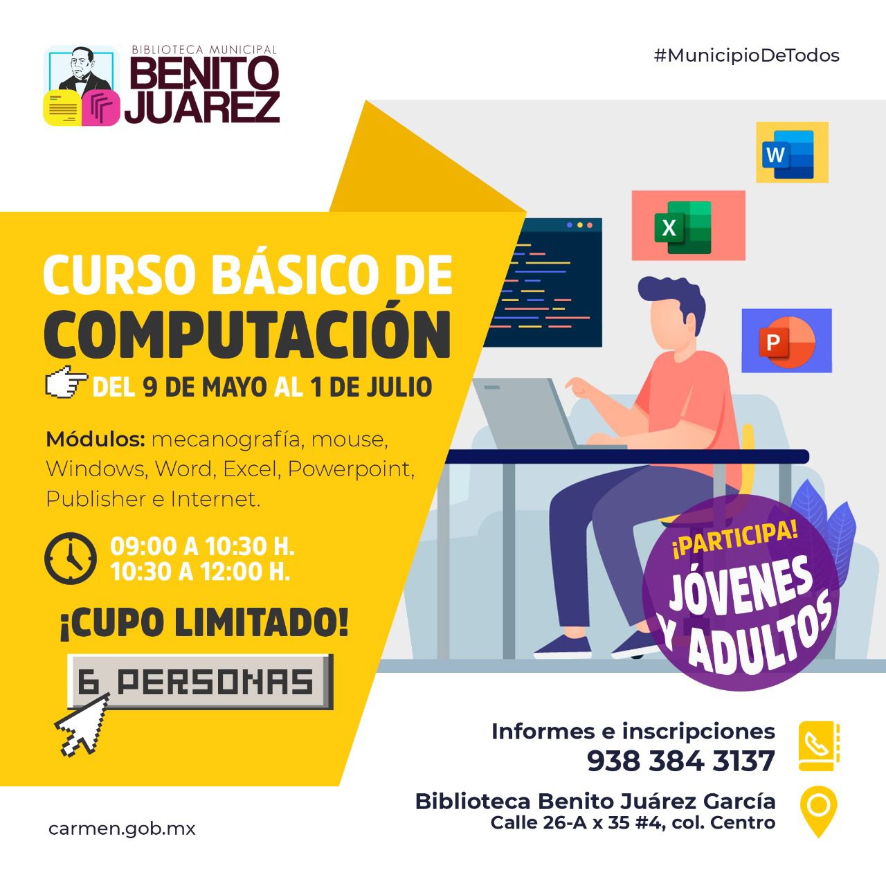 Para ser parte de los cursos, puedes acudir a la Biblioteca Pública Municipal “Benito Juárez García” en la calle 26-A por 35 núm. 4 de la Col. Centro.