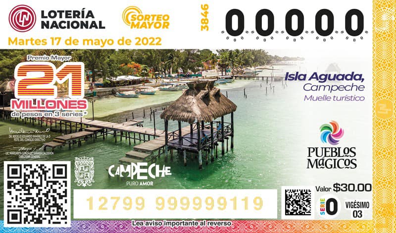 El Sorteo Mayor No. 3846 se llevará a cabo en el Salón de Sorteos del Edificio Moro de la Lotería Nacional, el martes 17 de mayo de 2022 en punto de las 20:00 horas, y pueden comprar sus cachitos a través de la página www.lotenal.gob.mx/Comercial/dondecomprar.html