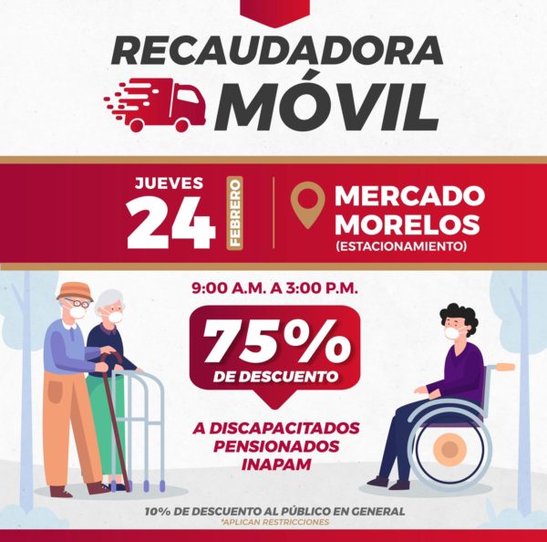Para que ahorres tiempo y que los trámites sean más accesibles, este jueves 24 de febrero la Recaudadora Móvil estará en el estacionamiento del Mercado Morelos de 9:00 A.M. a 3:00 P.M., donde podrás realizar tu pago de impuesto predial.