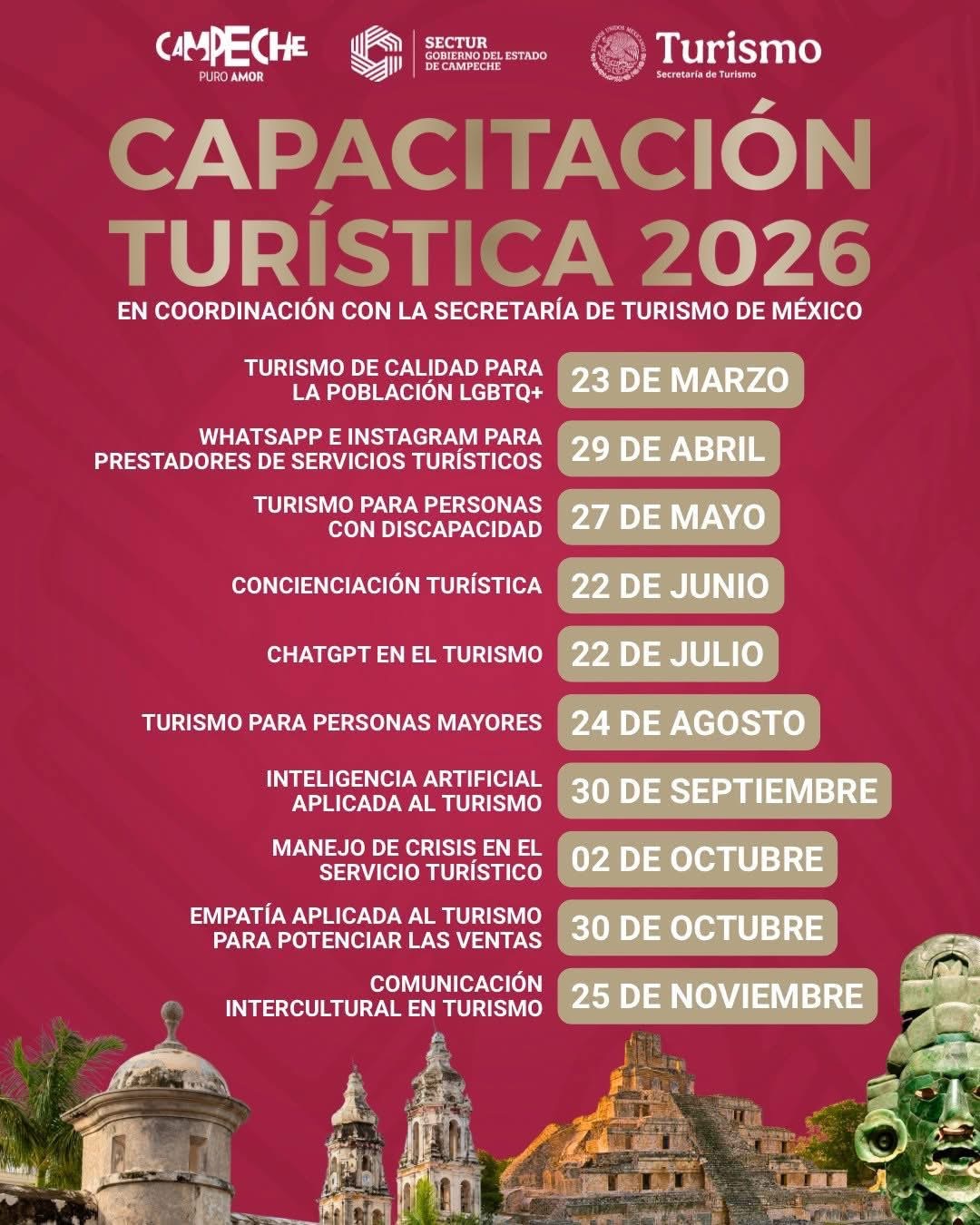 La Secretaría de Turismo de México, en #colaboración con la Secretaría de Turismo del Estado de Campeche, presenta el programa de Capacitación Turística 2026 dirigido a prestadores de servicios turísticos y a quienes buscan fortalecer sus competencias profesionales para brindar servicios más #inclusivos, #innovadores y de #calidad.