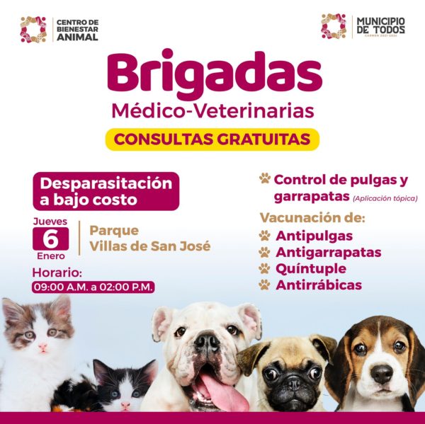 Garantizando el bienestar de los amigos perrunos y gatunos, el Gobierno Municipal de Carmen que encabeza el Alcalde Pablo Gutiérrez Lazarus, a través del Centro de Bienestar Animal, realizará la Brigada Médico-Veterinaria este jueves 6 de enero en el Parque de Villas de San José, en horario de 9:00 A.M. a 2:00 P.M.