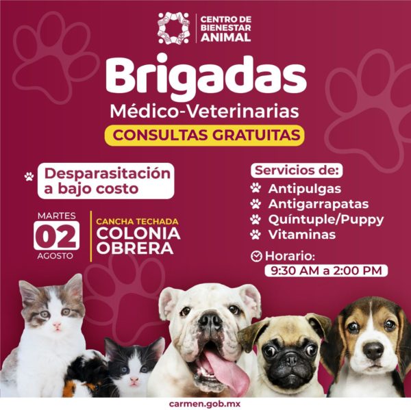 La Brigada Médico-Veterinaria llega mañana MARTES 02 de agosto a la Cancha Techada de la colonia Obrera, de 9:30 A.M. a 2:00 P.M., para brindar atención a los animalitos domésticos y a callejeritos.
