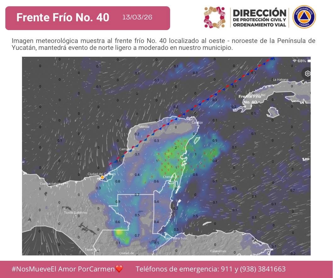 13/03/26 09:00 h ⛈️ Imagen meteorológica muestra al #FrenteFrio No. 40 desplazándose lentamente sobre el oeste – noroeste de la Península de Yucatán, mantiene un “evento de norte ligero a moderado” en la región, con probabilidad lluvias aisladas y rachas de viento de 40 km/h.