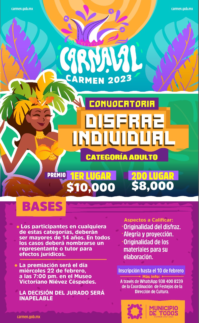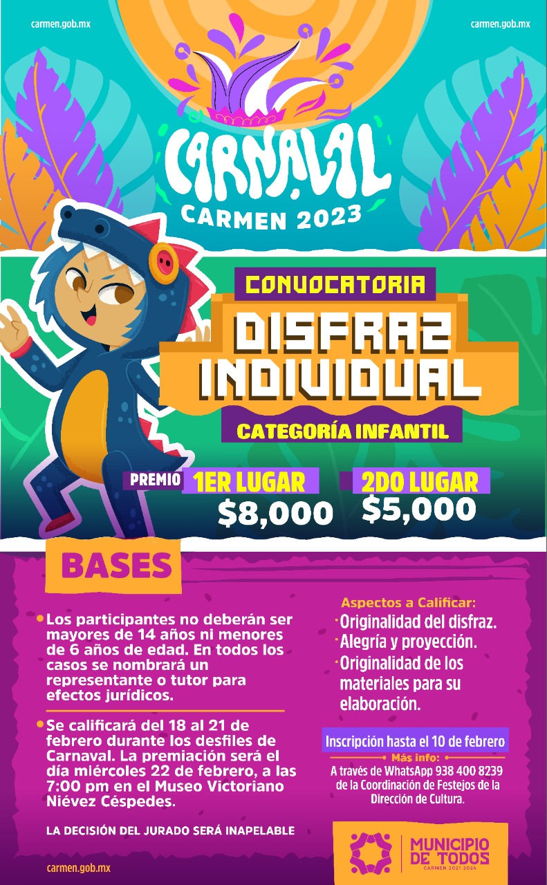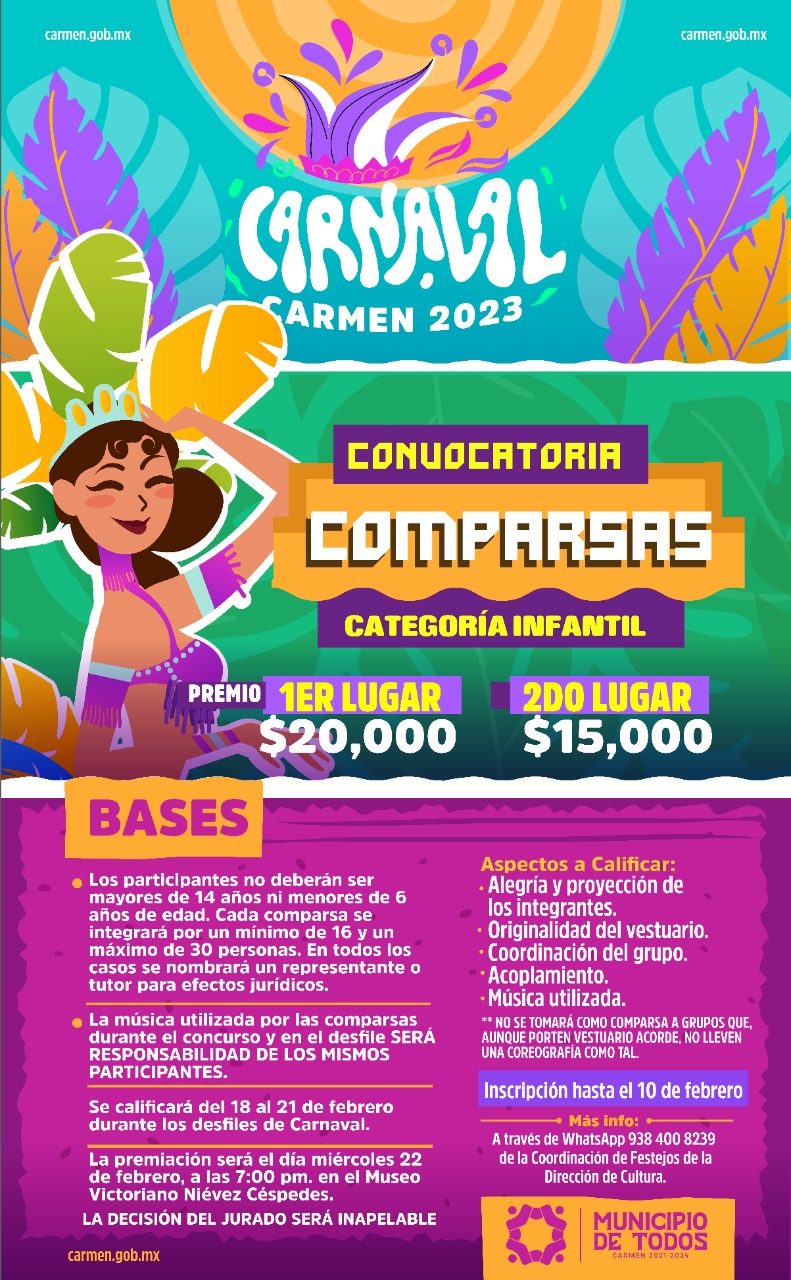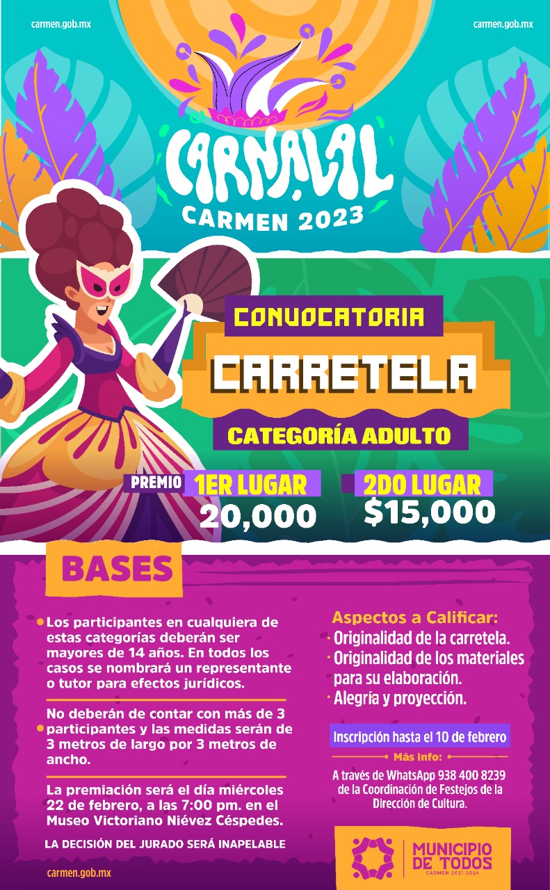 Disfruta de la diversión en el Carnaval de Todos, el Gobierno Municipal de Carmen, a través de la Dirección de Educación y Cultura, convoca a la ciudadanía en general a participar en los diversos concursos que se realizarán en el marco de las fiestas carnestolendas en su edición 2023.